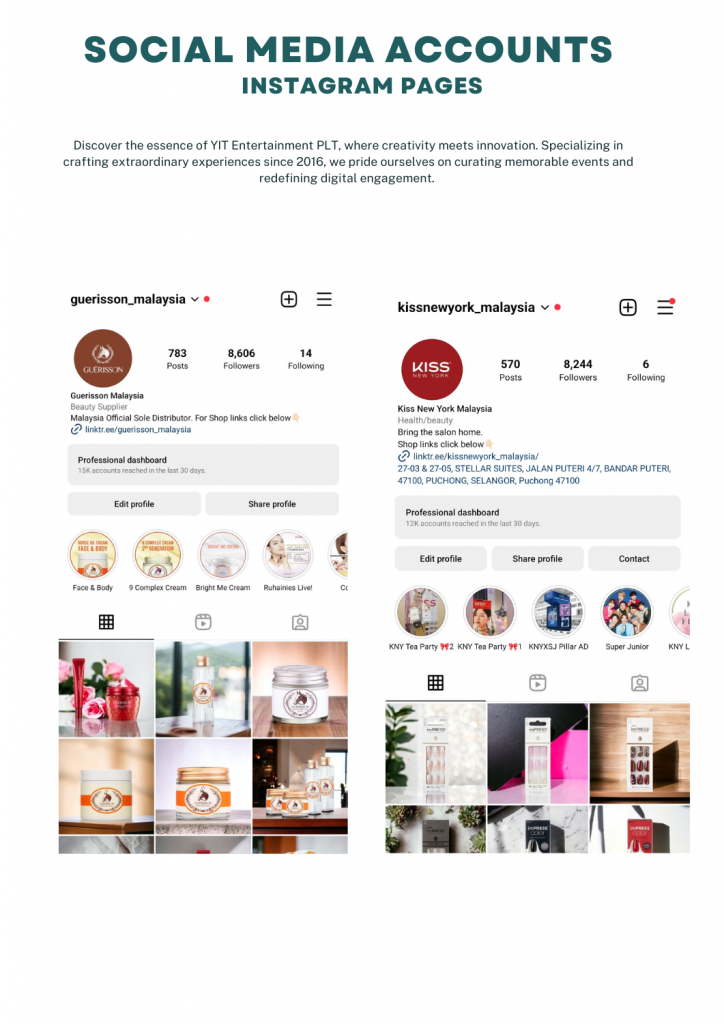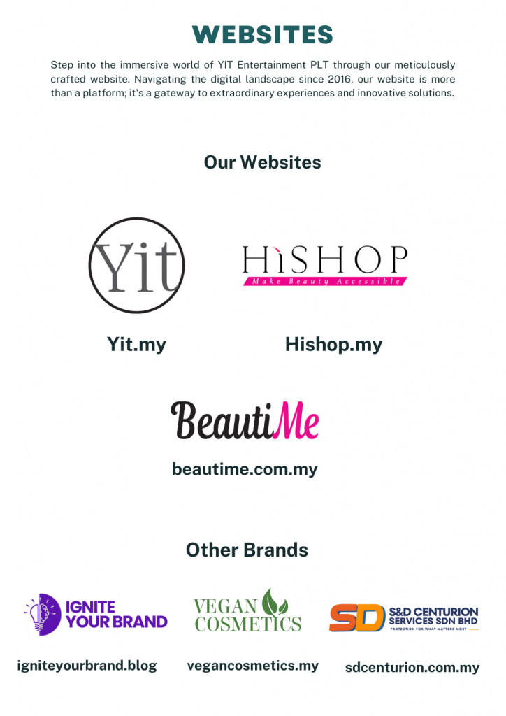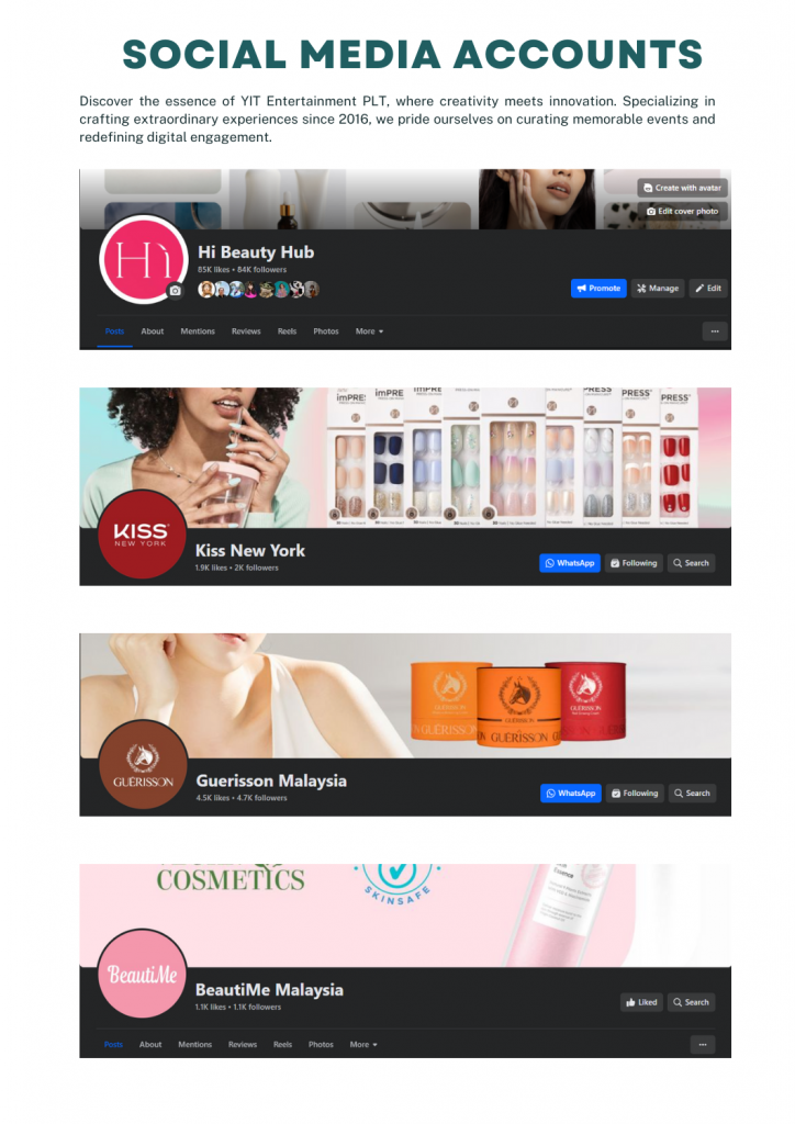 Established in 2016 as a subsidiary of Yap International Trading Sdn Bhd, YIT Entertainment PLT stands at the forefront of the entertainment and digital marketing landscape. Born from the visionary aspirations of its parent company, YIT Entertainment seamlessly integrates creativity and technology to bring forth innovative solutions for the modern age. Our commitment to excellence is evident in our approach to event creation, where we transform occasions into curated experiences that linger in the hearts of attendees. Managing the social media presence of products distributed by Yap International Trading Sdn Bhd is a key aspect of our operations, strategically enhancing brand visibility and engagement